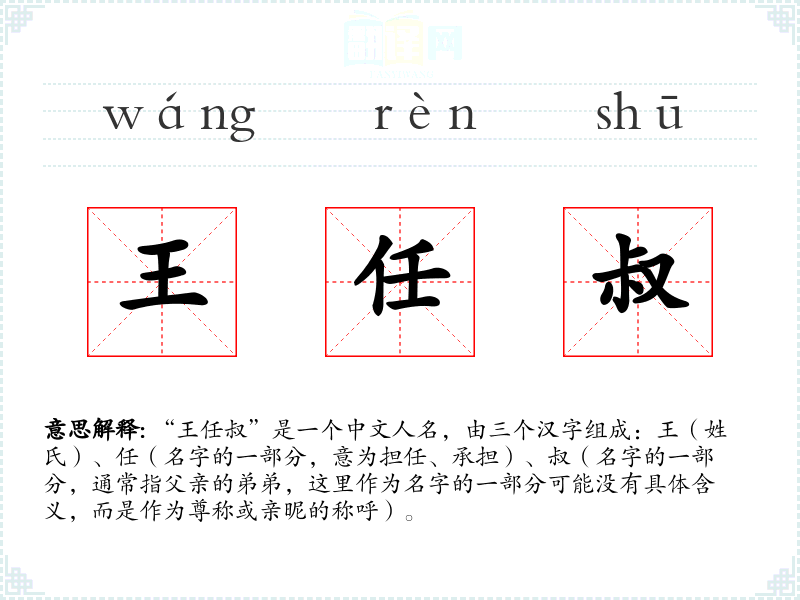 “王任叔”作为一个具体人名,其词源和演变主要取决于使用者的家族历史和文化背景。在中文命名传统中,姓氏“王”是一个非常常见的姓氏,而“任”和“叔”作为名字的一部分,可能反映了家族的期望或文化偏好。