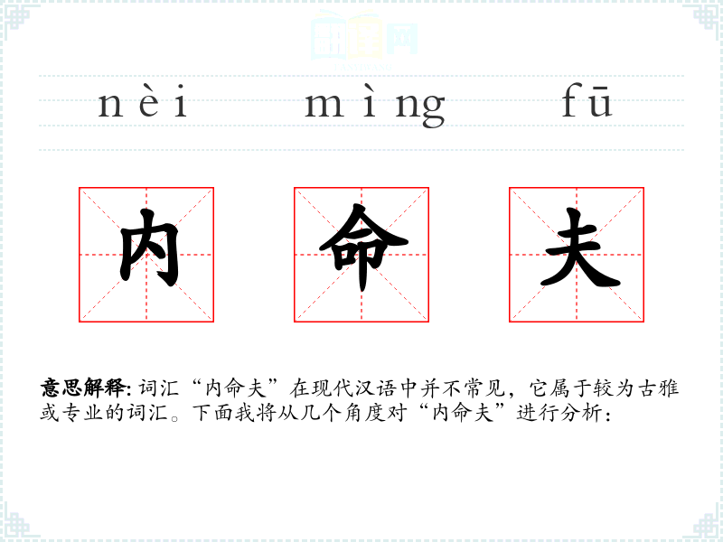 词汇“内命夫”在现代汉语中并不常见,它属于较为古雅或专业的词汇。下面我将从几个角度对“内命夫”进行分析: