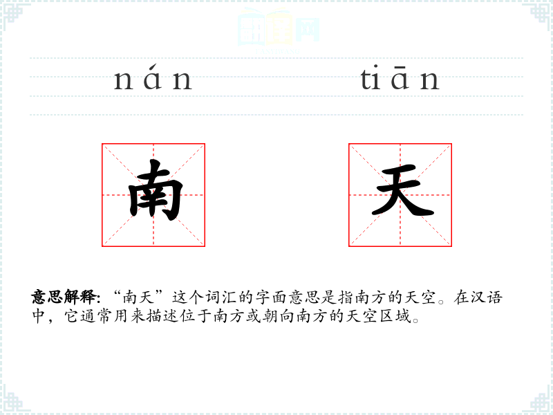 “南天”这个词汇在汉语中历史悠久,其构成简单明了,由“南”和“天”两个字组成。在古代文学和诗歌中,它就已经被广泛使用,至今含义基本保持不变。