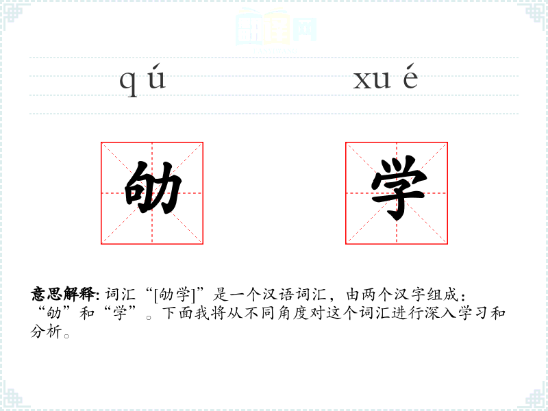 通过对“劬学”这个词汇的深入学,我更加理解了勤奋学的重要性。这个词汇不仅在语言上具有丰富的内涵,而且在文化和社会中扮演着重要的角色,激励着人们追求知识和进步。