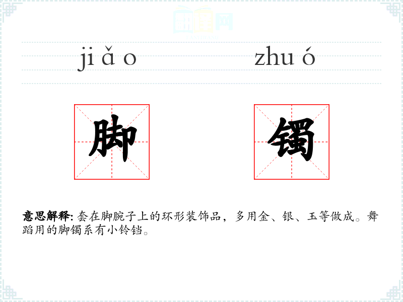 套在脚腕子上的环形装饰品,多用金、银、玉等做成。舞蹈用的脚镯系有小铃铛。