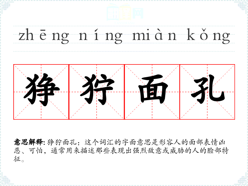 狰狞面孔:这个词汇的字面意思是形容人的面部表情凶恶、可怕,通常用来描述那些表现出强烈敌意或威胁的人的脸部特征。