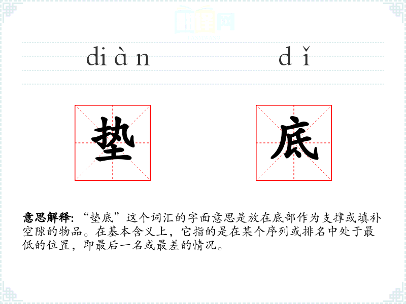 “垫底”这个词汇的字面意思是放在底部作为支撑或填补空隙的物品。在基本含义上,它指的是在某个序列或排名中处于最低的位置,即最后一名或最差的情况。