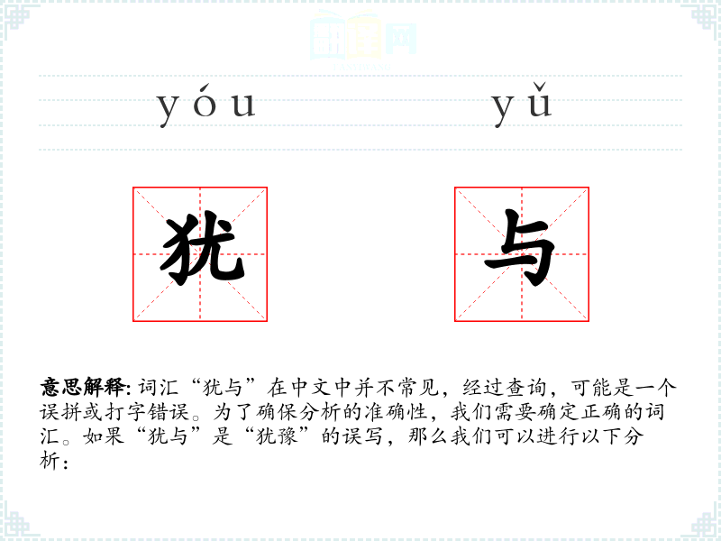 词汇“犹与”在中文中并不常见,经过查询,可能是一个误拼或打字错误。为了确保分析的准确性,我们需要确定正确的词汇。如果“犹与”是“犹豫”的误写,那么我们可以进行以下分析: