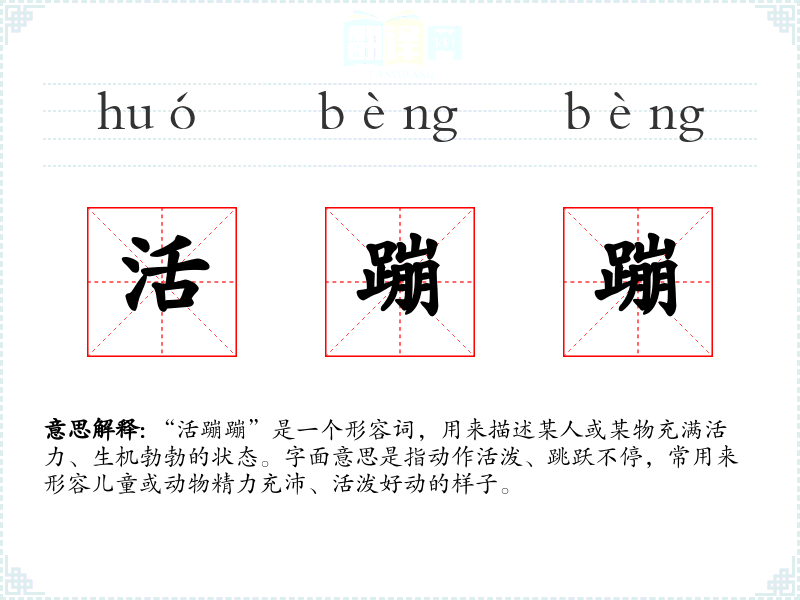 “活蹦蹦”是一个形容词,用来描述某人或某物充满活力、生机勃勃的状态。字面意思是指动作活泼、跳跃不停,常用来形容儿童或动物精力充沛、活泼好动的样子。