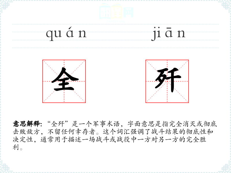 “全歼”是一个军事术语,字面意思是指完全消灭或彻底击败敌方,不留任何幸存者。这个词汇强调了战斗结果的彻底性和决定性,通常用于描述一场战斗或战役中一方对另一方的完全胜利。