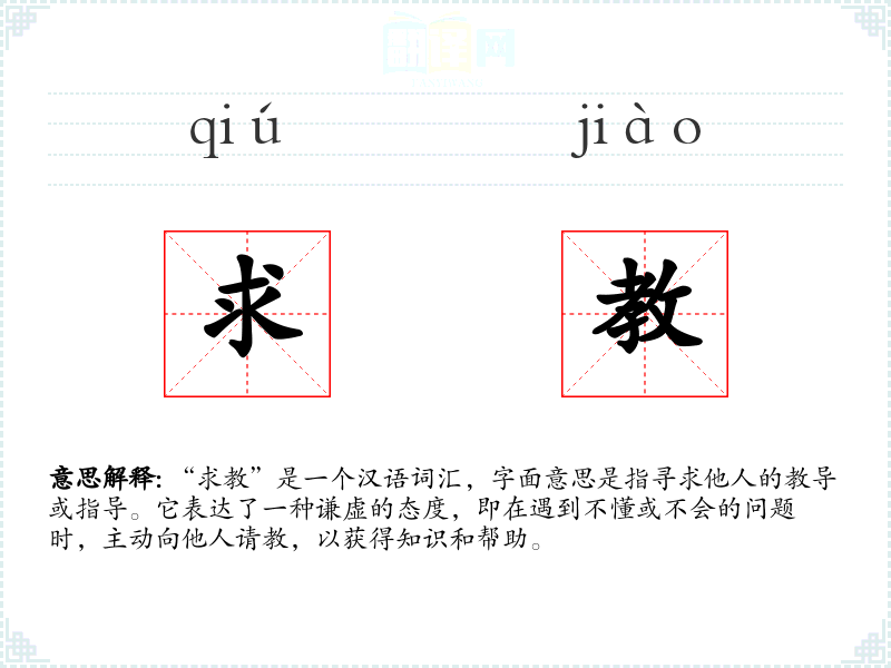 “求教”是一个汉语词汇,字面意思是指寻求他人的教导或指导。它表达了一种谦虚的态度,即在遇到不懂或不会的问题时,主动向他人请教,以获得知识和帮助。