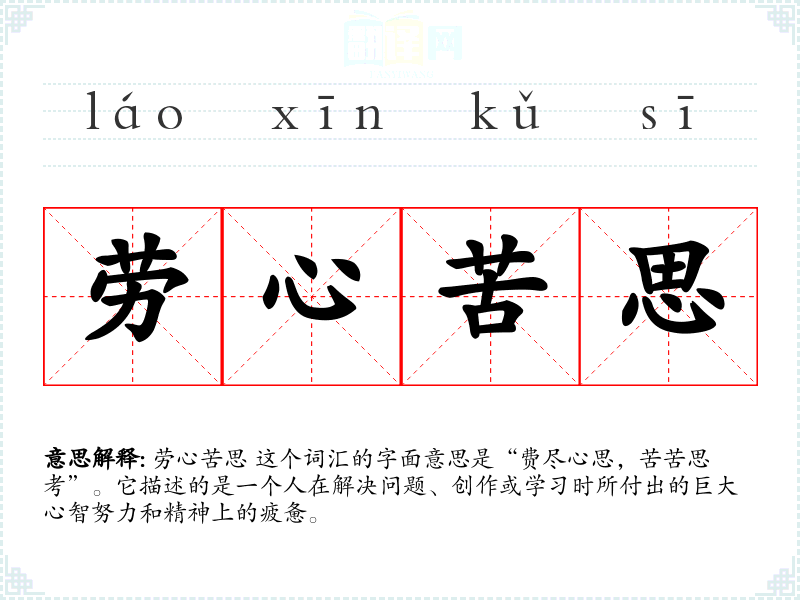 劳心苦思 这个词汇的字面意思是“费尽心思,苦苦思考”。它描述的是一个人在解决问题、创作或学*时所付出的巨大心智努力和精神上的疲惫。