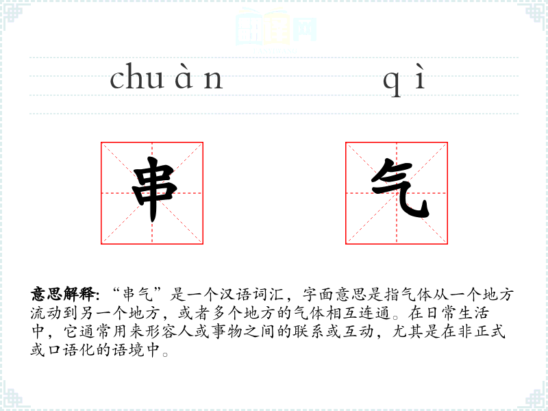 “串气”一词的词源较为直接,由“串”和“气”两个字组成。在古代汉语中,“串”有连通、串联的意思,“气”则指气体或气息。随着语言的发展,“串气”逐渐被引申为形容人或事物之间的联系。