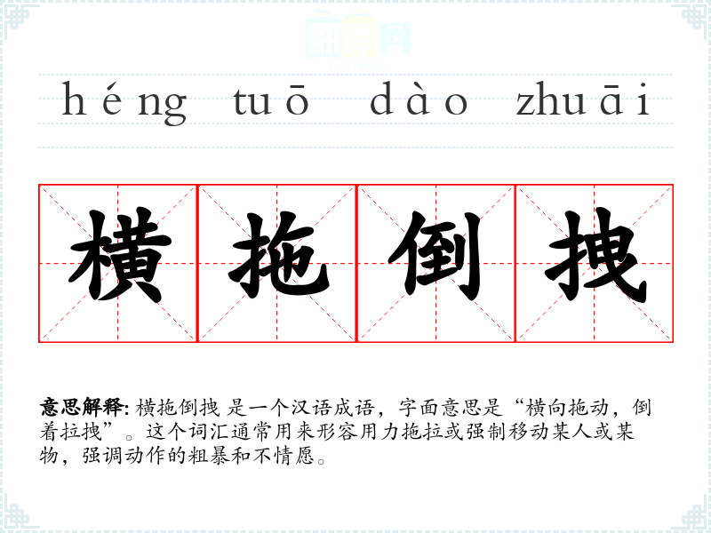 横拖倒拽 是一个汉语成语,字面意思是“横向拖动,倒着拉拽”。这个词汇通常用来形容用力拖拉或强制移动某人或某物,强调动作的粗暴和不情愿。