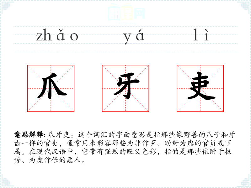 爪牙吏:这个词汇的字面意思是指那些像野兽的爪子和牙齿一样的官吏,通常用来形容那些为非作歹、助纣为虐的官员或下属。在现代汉语中,它带有强烈的贬义色彩,指的是那些依附于权势、为虎作伥的恶人。