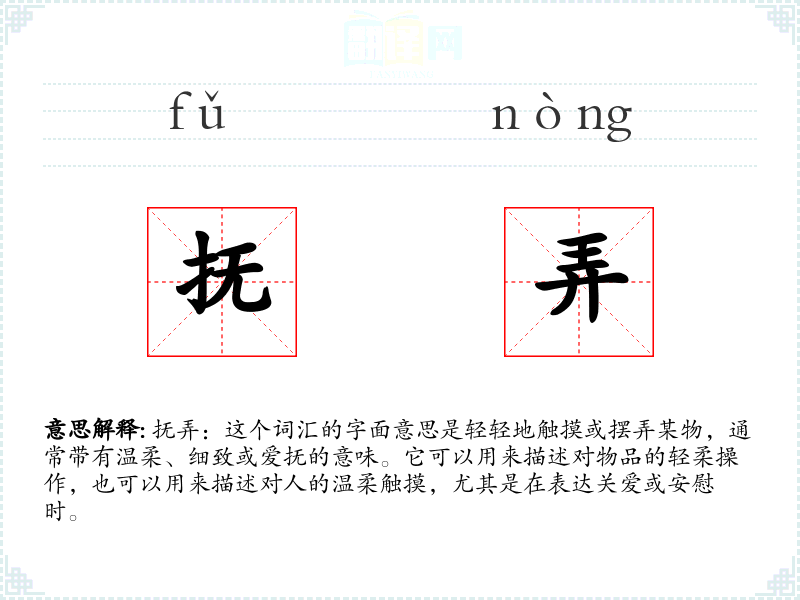 抚弄:这个词汇的字面意思是轻轻地触摸或摆弄某物,通常带有温柔、细致或爱抚的意味。它可以用来描述对物品的轻柔操作,也可以用来描述对人的温柔触摸,尤其是在表达关爱或安慰时。