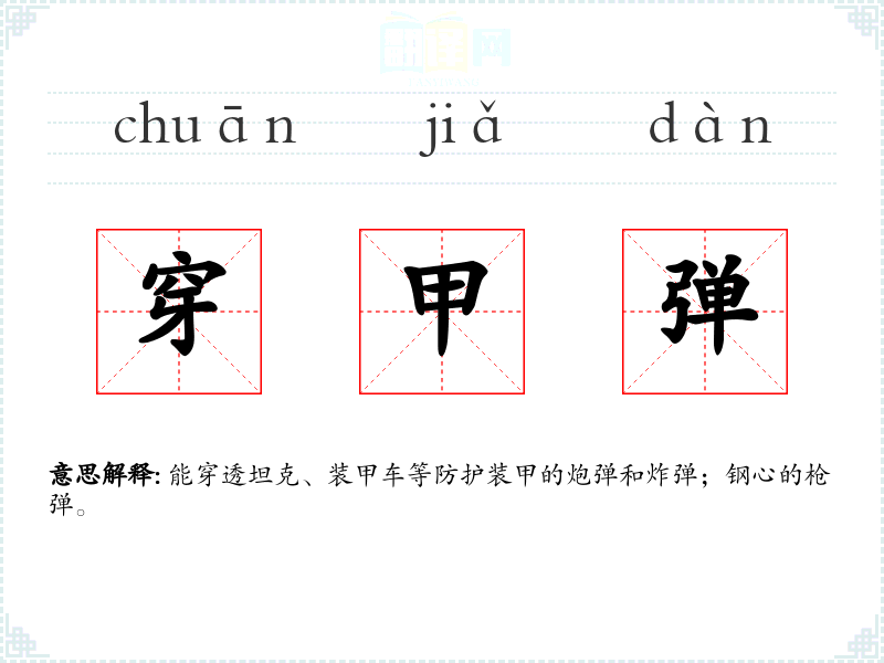 能穿透坦克、装甲车等防护装甲的炮弹和炸弹;钢心的枪弹。