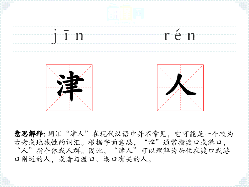 词汇“津人”在现代汉语中并不常见,它可能是一个较为古老或地域性的词汇。根据字面意思,“津”通常指渡口或港口,“人”指个体或人群。因此,“津人”可以理解为居住在渡口或港口附近的人,或者与渡口、港口有关的人。