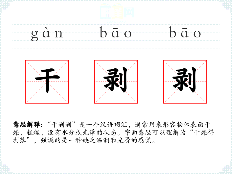 “干剥剥”是一个汉语词汇,通常用来形容物体表面干燥、粗糙、没有水分或光泽的状态。字面意思可以理解为“干燥得剥落”,强调的是一种缺乏滋润和光滑的感觉。