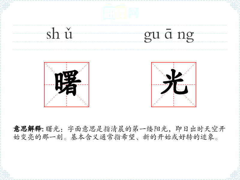 曙光:字面意思是指清晨的第一缕阳光,即日出时天空开始变亮的那一刻。基本含义通常指希望、新的开始或好转的迹象。