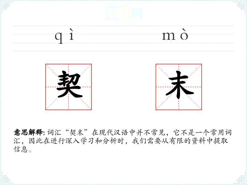 词汇“契末”在现代汉语中并不常见,它不是一个常用词汇,因此在进行深入学习和分析时,我们需要从有限的资料中提取信息。