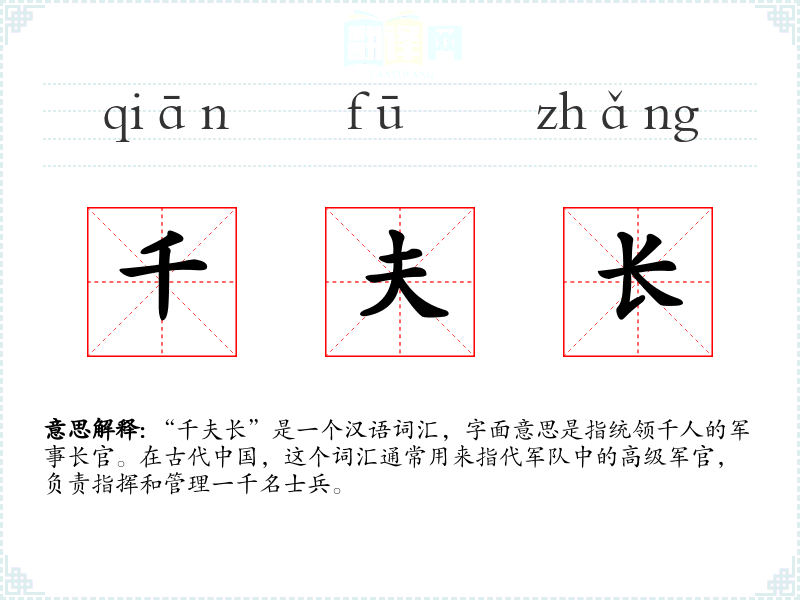 “千夫长”是一个汉语词汇,字面意思是指统领千人的军事长官。在古代**,这个词汇通常用来指代军队中的高级军官,负责指挥和管理一千名士兵。