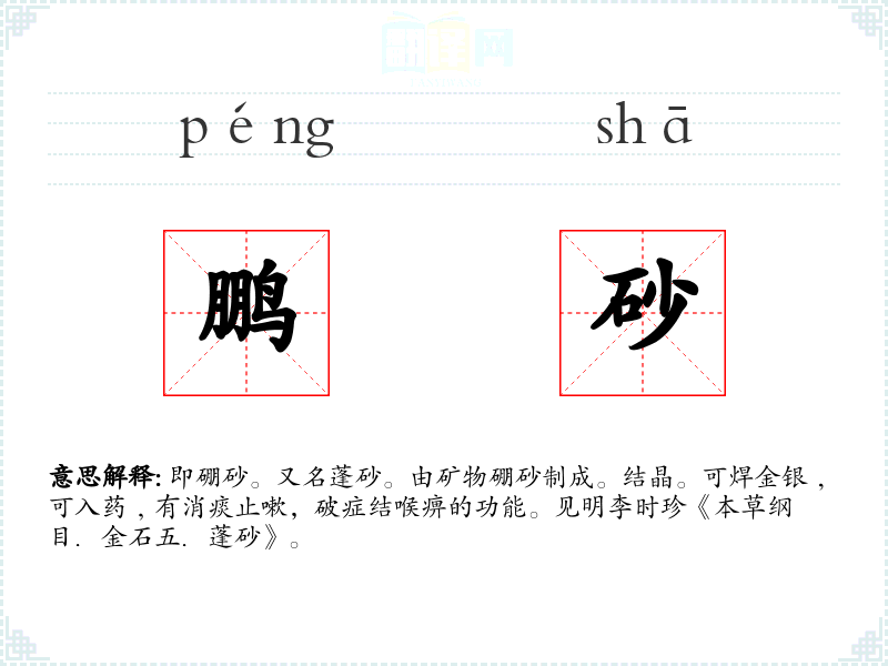 即硼砂。又名蓬砂。由矿物硼砂制成。结晶。可焊金银﹐可入药﹐有消痰止嗽,破症结喉痹的功能。见明李时珍《本草纲目.金石五.蓬砂》。