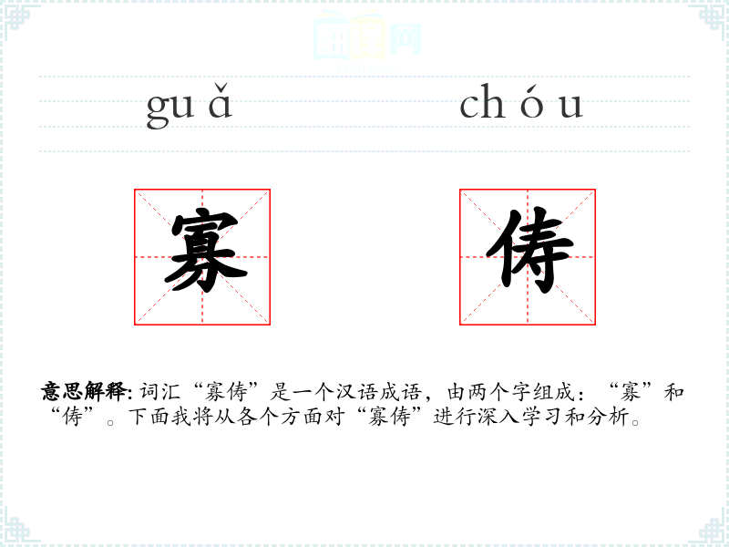 “寡俦”字面意思是指朋友少,伴侣少。其中,“寡”意味着少,“俦”通常指伴侣或同伴。因此,“寡俦”整体上描述的是一个人在社交关系中朋友不多,缺乏伴侣或同伴的状态。