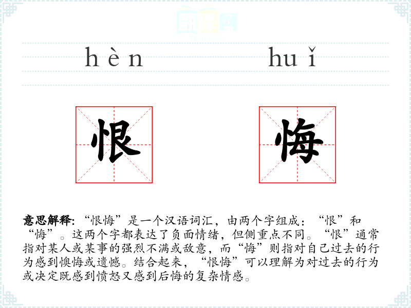 “恨悔”是一个汉语词汇,由两个字组成:“恨”和“悔”。这两个字都表达了负面情绪,但侧重点不同。“恨”通常指对某人或某事的强烈不满或敌意,而“悔”则指对自己过去的行为感到懊悔或遗憾。结合起来,“恨悔”可以理解为对过去的行为或决定既感到愤怒又感到后悔的复杂情感。