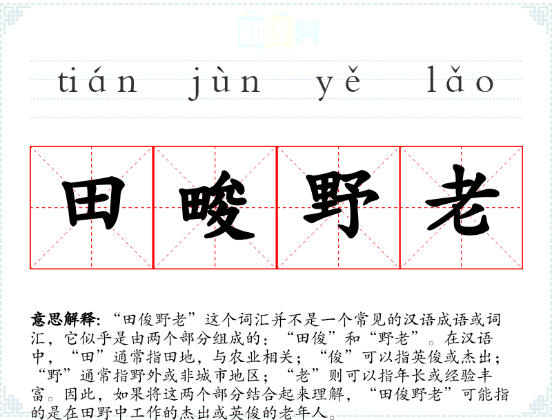 “田俊野老”这个词汇并不是一个常见的汉语成语或词汇,它似乎是由两个部分组成的:“田俊”和“野老”。在汉语中,“田”通常指田地,与农业相关;“俊”可以指英俊或杰出;“野”通常指野外或非城市地区;“老”则可以指年长或经验丰富。因此,如果将这两个部分结合起来理解,“田俊野老”可能指的是在田野中工作的杰出或英俊的老年人。