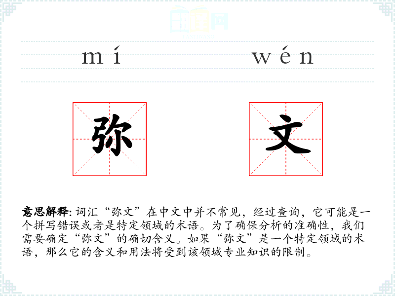 假设“弥文”是一个拼写错误,我们可能需要寻找一个更常见的词汇来替代它进行分析。如果“弥文”确实存在,但由于其罕见性,我们可能无法找到足够的信息来进行全面的分析。
