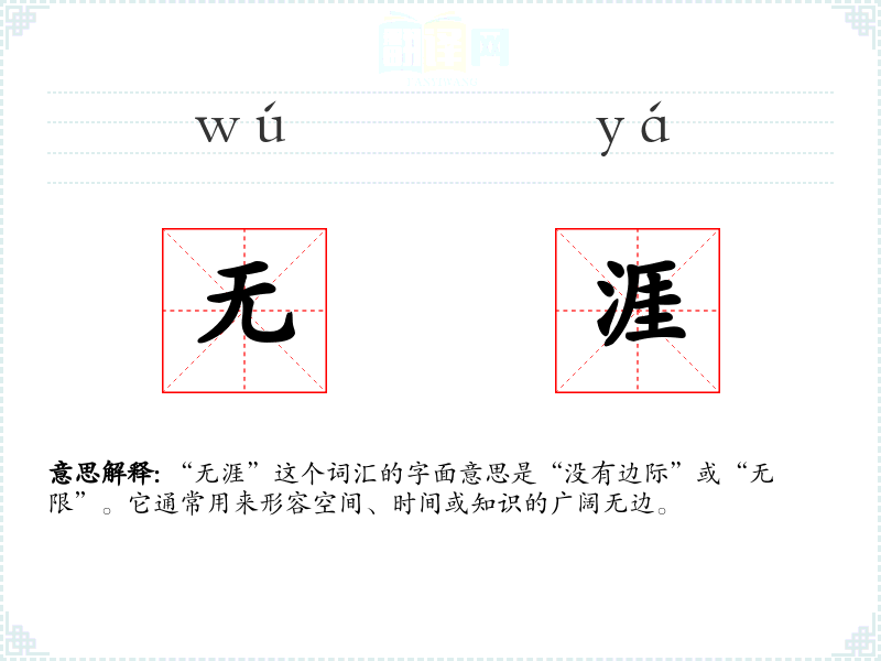“无涯”这个词汇的字面意思是“没有边际”或“无限”。它通常用来形容空间、时间或知识的广阔无边。