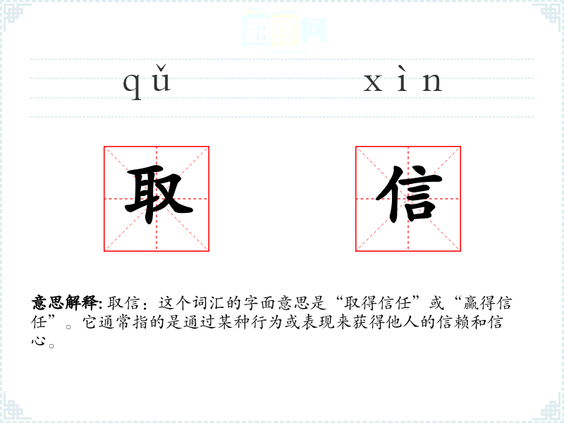取信:这个词汇的字面意思是“取得信任”或“赢得信任”。它通常指的是通过某种行为或表现来获得他人的信赖和信心。