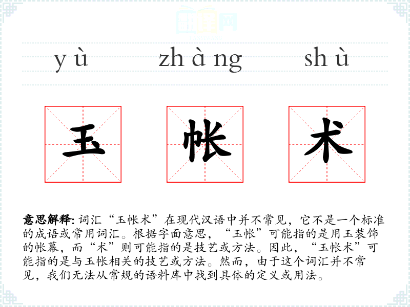 由于“玉帐术”不是一个标准词汇,我们无法提供一个确切的基本定义。它可能是一个特定领域或文化中的术语,或者是某个特定文本中创造的词汇。
