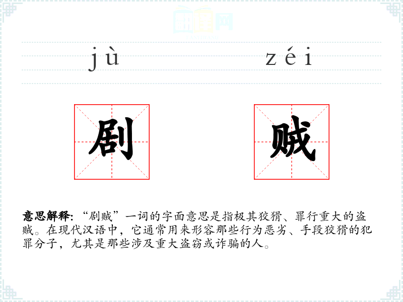 “剧贼”一词的字面意思是指极其狡猾、罪行重大的盗贼。在现代汉语中,它通常用来形容那些行为恶劣、手段狡猾的犯罪分子,尤其是那些涉及重大盗窃或诈骗的人。
