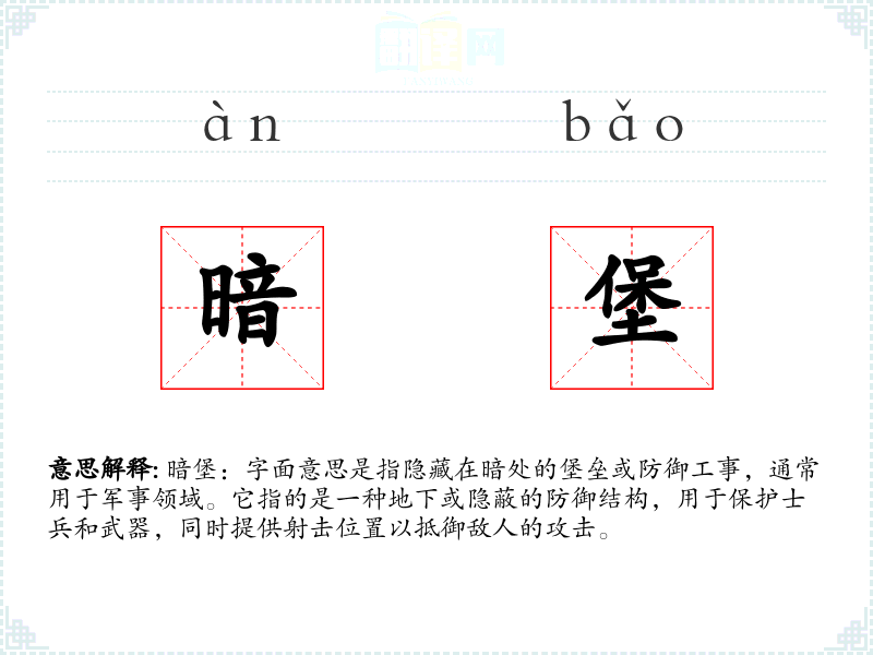 暗堡:字面意思是指隐藏在暗处的堡垒或防御工事,通常用于军事领域。它指的是一种地下或隐蔽的防御结构,用于保护士兵和武器,同时提供射击位置以抵御敌人的攻击。