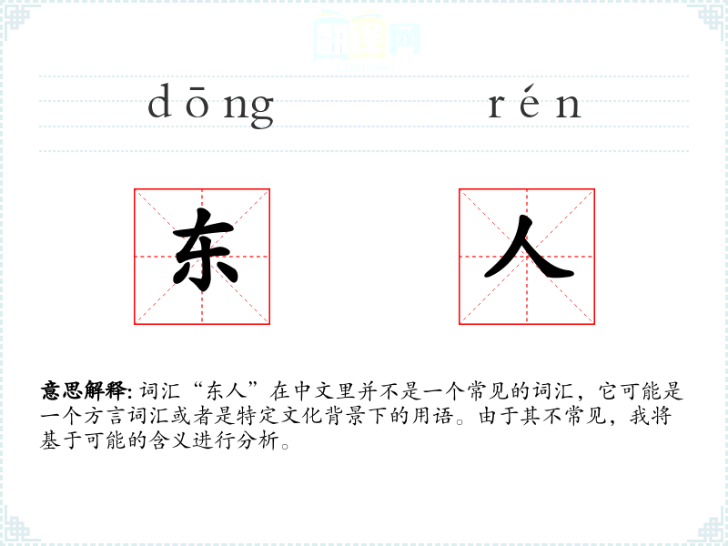 “东人”字面意思可能指的是来自东方的人,或者与东方有关的人。在某些方言或特定语境中,它可能指代某个具体地区的人。