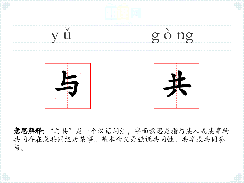 “与共”是一个汉语词汇,字面意思是指与某人或某事物共同存在或共同经历某事。基本含义是强调共同性、共享或共同参与。