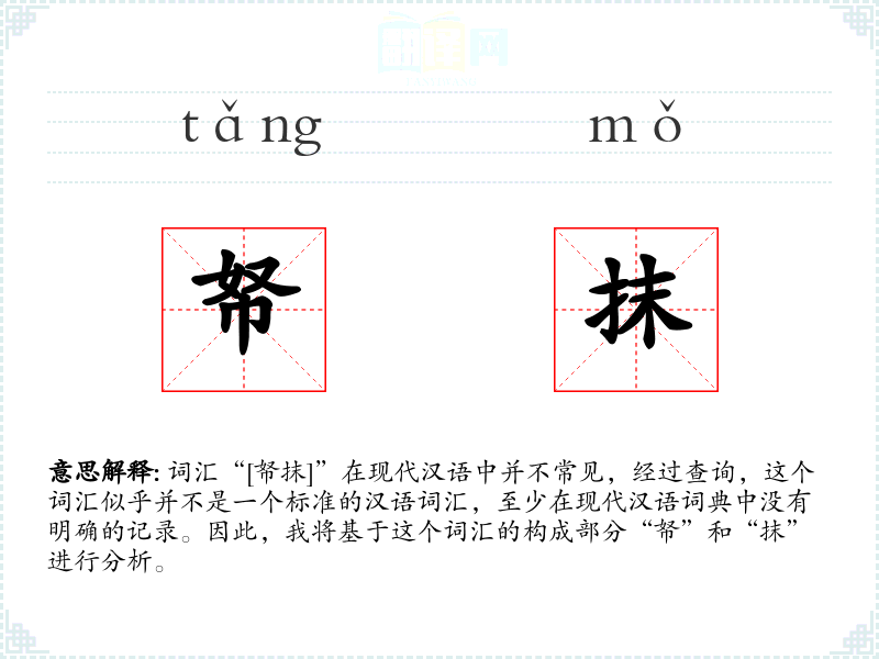 词汇“[帑抹]”在现代汉语中并不常见,经过查询,这个词汇似乎并不是一个标准的汉语词汇,至少在现代汉语词典中没有明确的记录。因此,我将基于这个词汇的构成部分“帑”和“抹”进行分析。