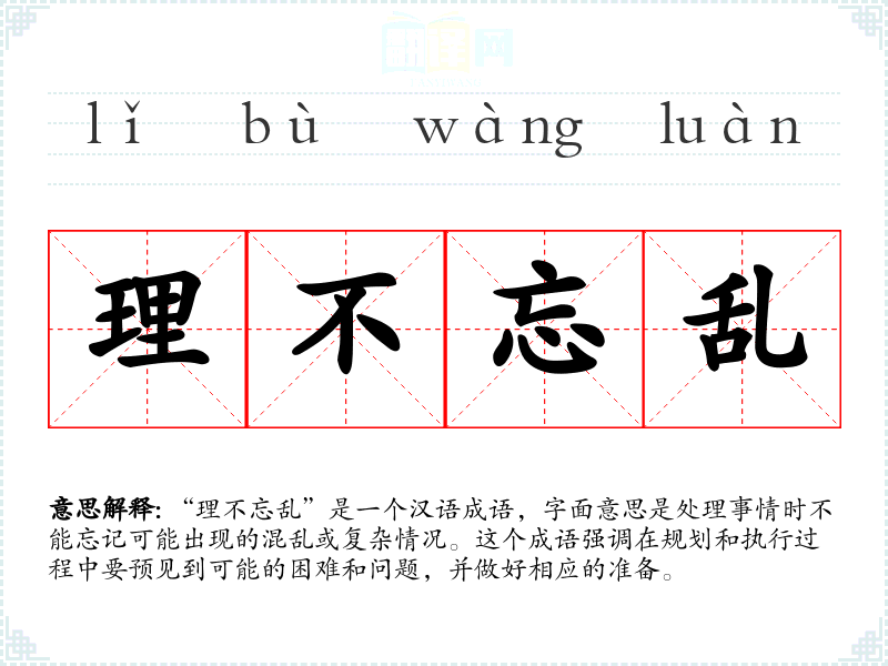 “理不忘乱”是一个汉语成语,字面意思是处理事情时不能忘记可能出现的混乱或复杂情况。这个成语强调在规划和执行过程中要预见到可能的困难和问题,并做好相应的准备。