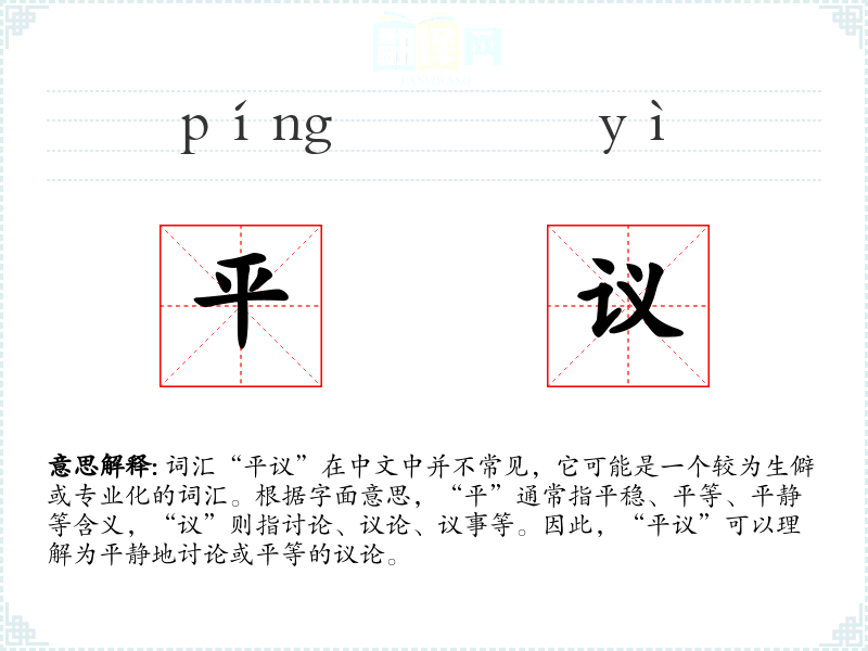 词汇“平议”在中文中并不常见,它可能是一个较为生僻或专业化的词汇。根据字面意思,“平”通常指平稳、平等、平静等含义,“议”则指讨论、议论、议事等。因此,“平议”可以理解为平静地讨论或平等的议论。