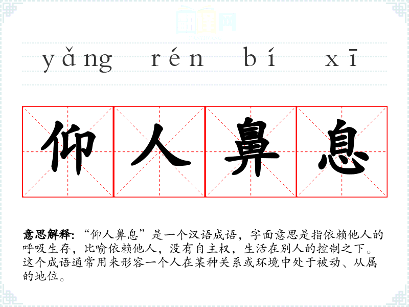 “仰人鼻息”是一个汉语成语,字面意思是指依赖他人的呼吸生存,比喻依赖他人,没有自主权,生活在别人的控制之下。这个成语通常用来形容一个人在某种关系或环境中处于被动、从属的地位。