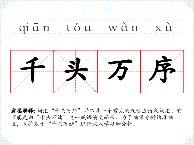 词汇“千头万序”并不是一个常见的汉语成语或词汇,它可能是由“千头万绪”这一成语演变而来。为了确保分析的准确性,我将基于“千头万绪”进行深入学*和分析。