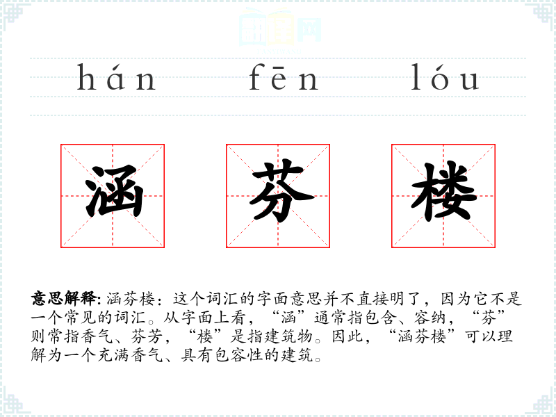 “涵芬楼”这个词汇虽然不常见,但它提供了一个丰富的想象空间,可以用来描述一个充满文化气息和历史深度的地点。在语言学习和表达中,这样的词汇可以增加文本的深度和美感。