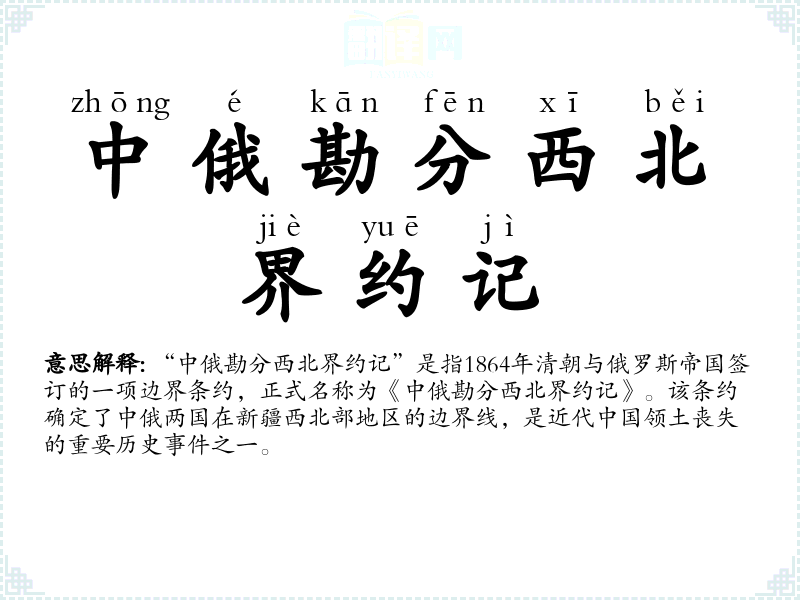 "中俄勘分西北界约记"的意思解释、中俄勘分西北界约记是什么意思由翻译网汉语词典查词提供。