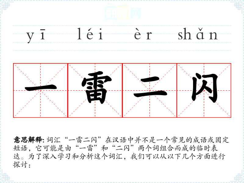 词汇“一雷二闪”在汉语中并不是一个常见的成语或固定短语,它可能是由“一雷”和“二闪”两个词组合而成的临时表达。为了深入学*和分析这个词汇,我们可以从以下几个方面进行探讨: