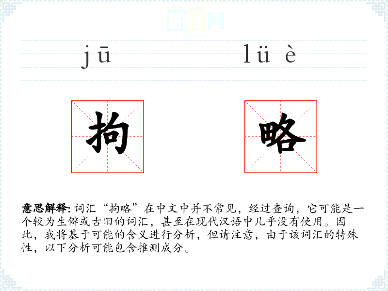 词汇“拘略”在中文中并不常见,经过查询,它可能是一个较为生僻或古旧的词汇,甚至在现代汉语中几乎没有使用。因此,我将基于可能的含义进行分析,但请注意,由于该词汇的特殊性,以下分析可能包含推测成分。