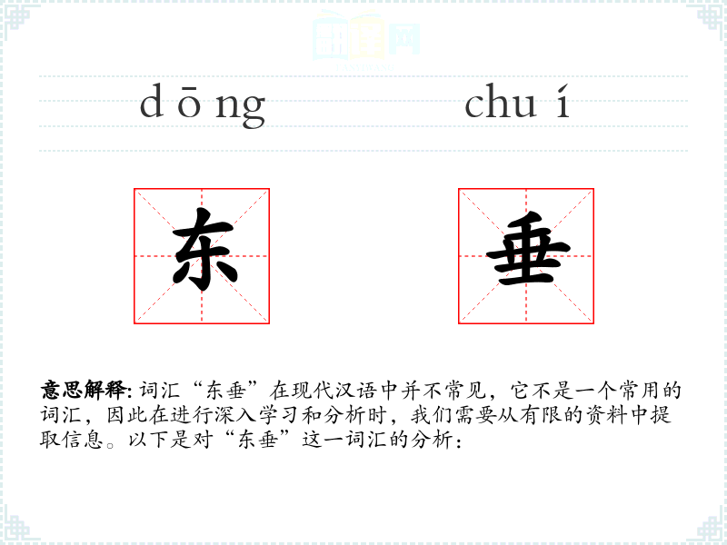 词汇“东垂”在现代汉语中并不常见,它不是一个常用的词汇,因此在进行深入学*和分析时,我们需要从有限的资料中提取信息。以下是对“东垂”这一词汇的分析: