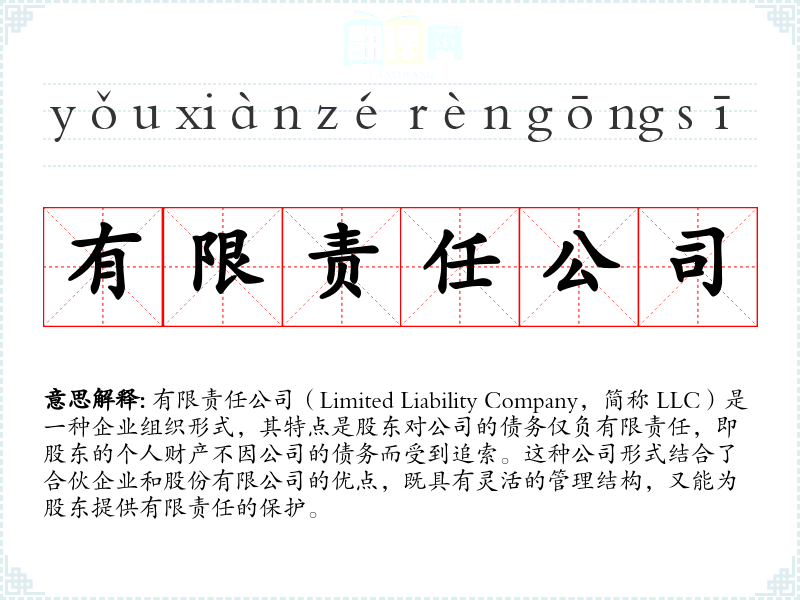 - 反义词:无限责任公司(Unlimited Liability Company)