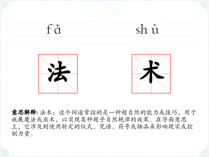 法术:这个词通常指的是一种超自然的能力或技巧,用于施展魔法或巫术,以实现某种超乎自然规律的效果。在字面意思上,它涉及到使用特定的仪式、咒语、符号或物品来影响现实或控制力量。