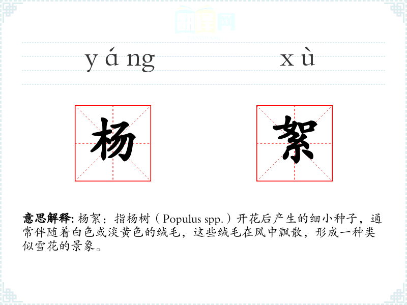 杨絮一词源自汉语,“杨”指杨树,“絮”指棉花状的细小物质。在古代文学中已有使用,如唐代诗人白居易的《赋得古原草送别》中有“杨花落尽子规啼”的描述,虽未直接提及杨絮,但杨花与杨絮有密切关联。