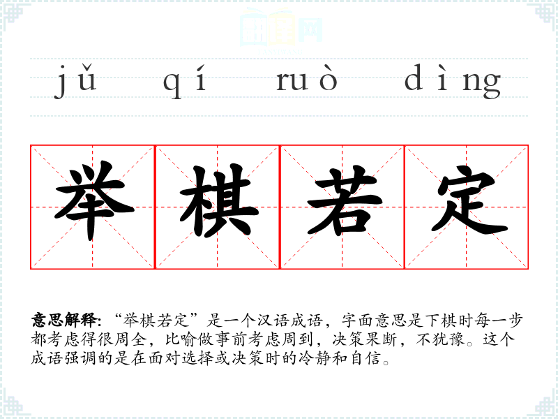 “举棋若定”是一个汉语成语,字面意思是下棋时每一步都考虑得很周全,比喻做事前考虑周到,决策果断,不犹豫。这个成语强调的是在面对选择或决策时的冷静和自信。