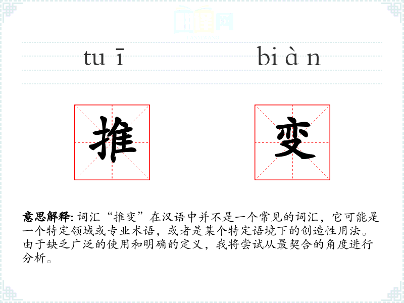 由于“推变”不是一个标准词汇,我们无法提供一个确切的基本定义。它可能是由“推”和“变”两个字组合而成的,字面意思可能是“推动变化”或“通过推理改变”。