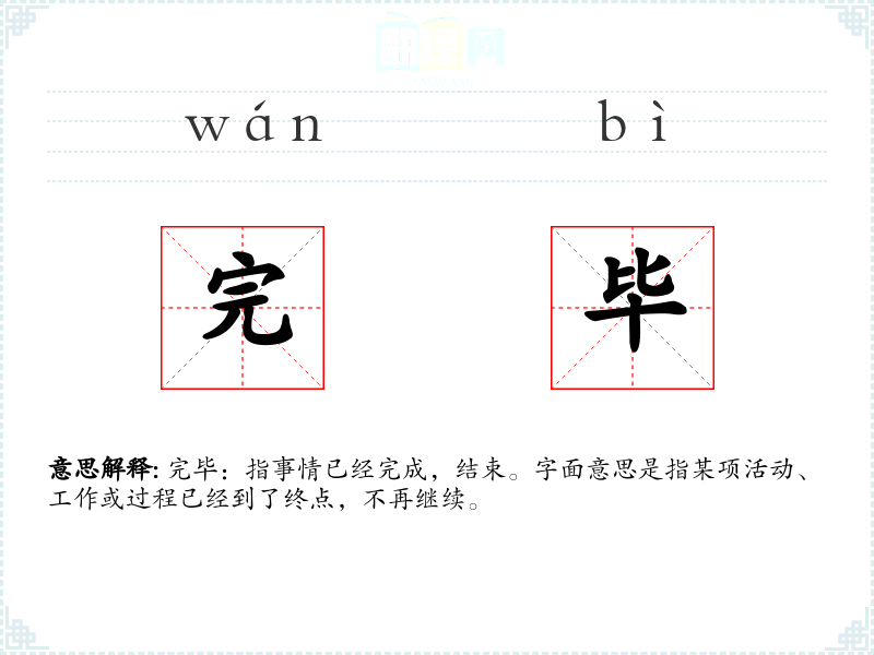 完毕:指事情已经完成,结束。字面意思是指某项活动、工作或过程已经到了终点,不再继续。
